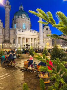 The Art Advent Market is located in Resselpark, right outside the magnificent Charles Church. It is pretty rustic with wooden huts and homemade signs. There is a wide variety of unique artisan gifts, ranging from pottery and jewelry to toys and wearables. We visited around dusk and it looked magical with the strings of lights and illuminated trees.