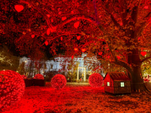 You will find this flying heart at Rathausplatz, which is also the most famous and busiest Christmas market in Vienna, situated outside the “Rathaus” (City Hall). Every 30 minutes from dusk until 9 pm, a heart glides down a cable from a tower to a tree filled with hearts, accompanied by twinkling music. It truly is a magical sight.