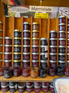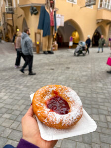 At the stalls, you will mostly find tons traditional Austrian food, sausages, meats and cheeses. Don’t forget to try the local specialties, Kiachl – fried dough pastry topped with Sauerkraut, sugar or cranberry jam and Krapfen –doughnuts filled with vanilla or chocolate. We picked up Kiachl topped with cranberry (could have easily gone back for Round 2) and delicious potato spirals on a stick.