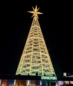 In the middle of the market stands the Swarovski Christmas tree, a 17.5 meter-high tree with more than 112,400 Swarovski crystals. And it changes colors every few minutes. Make sure to come here at night where you can see the giant Swarovski tree all lit up!