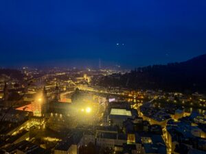 There were trumpeters playing under a giant Christmas tree decorated by local children. It was the perfect spot to sip a mug of Glühwein as you gaze over the twinkling lights and rooftops of Salzburg Altstadt.