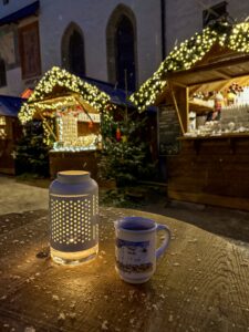 Stalls are spread throughout the historic center, with beautiful Christmas lights and festive decorations all around. We picked up jacket potatoes and ginger carrot soup for lunch from one of the stalls and finished with a cuppa coffee from one of the cafes.